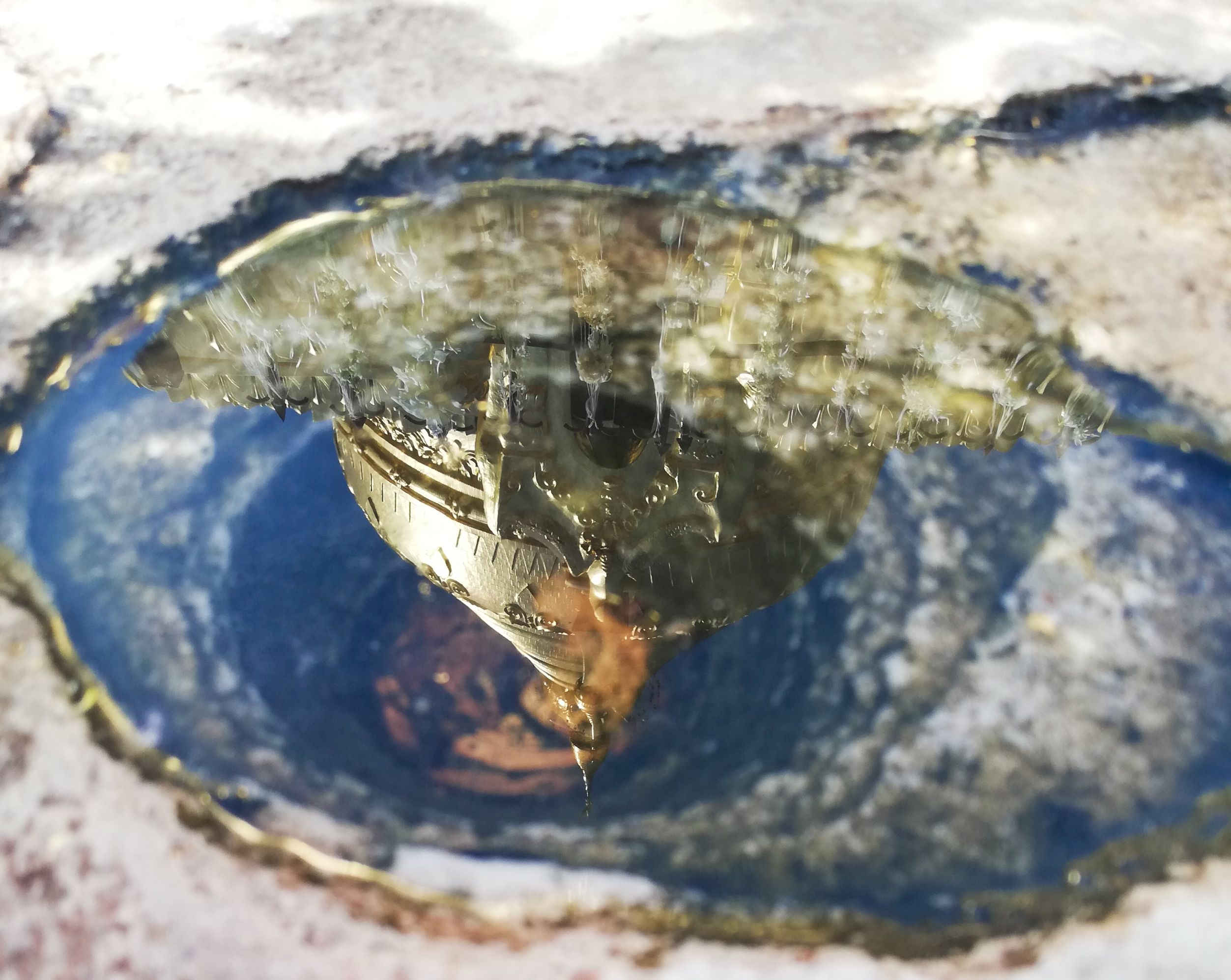 Ohne dieses schlaue Buch (liebevoll nur "der Stefan" genannt) wären wir wahrscheinlich schnöde an einer der Top-Attraktionen vorbeigelatscht: der mystischen Pfütze. Ja es ist nur eine Pfütze, aber tatsächlich eine besonders sehenswerte. Die goldene Kuppel der Pagode spiegelt sich perfekt in dem kleinen Wasserloch ... nun gut, es bleibt nur eine Pfütze. Und trotzdem ertappte man sich plötzlich selbst dabei, wie man eine Weile regungslos in die golden schimmernde Pagoden-Suppe starrte und sich in deren Anblick verlor. Vielleicht wartete man auch einfach darauf, dass das Getrampel eines T-Rex die wundersam ruhige Fläche zerstören würde.