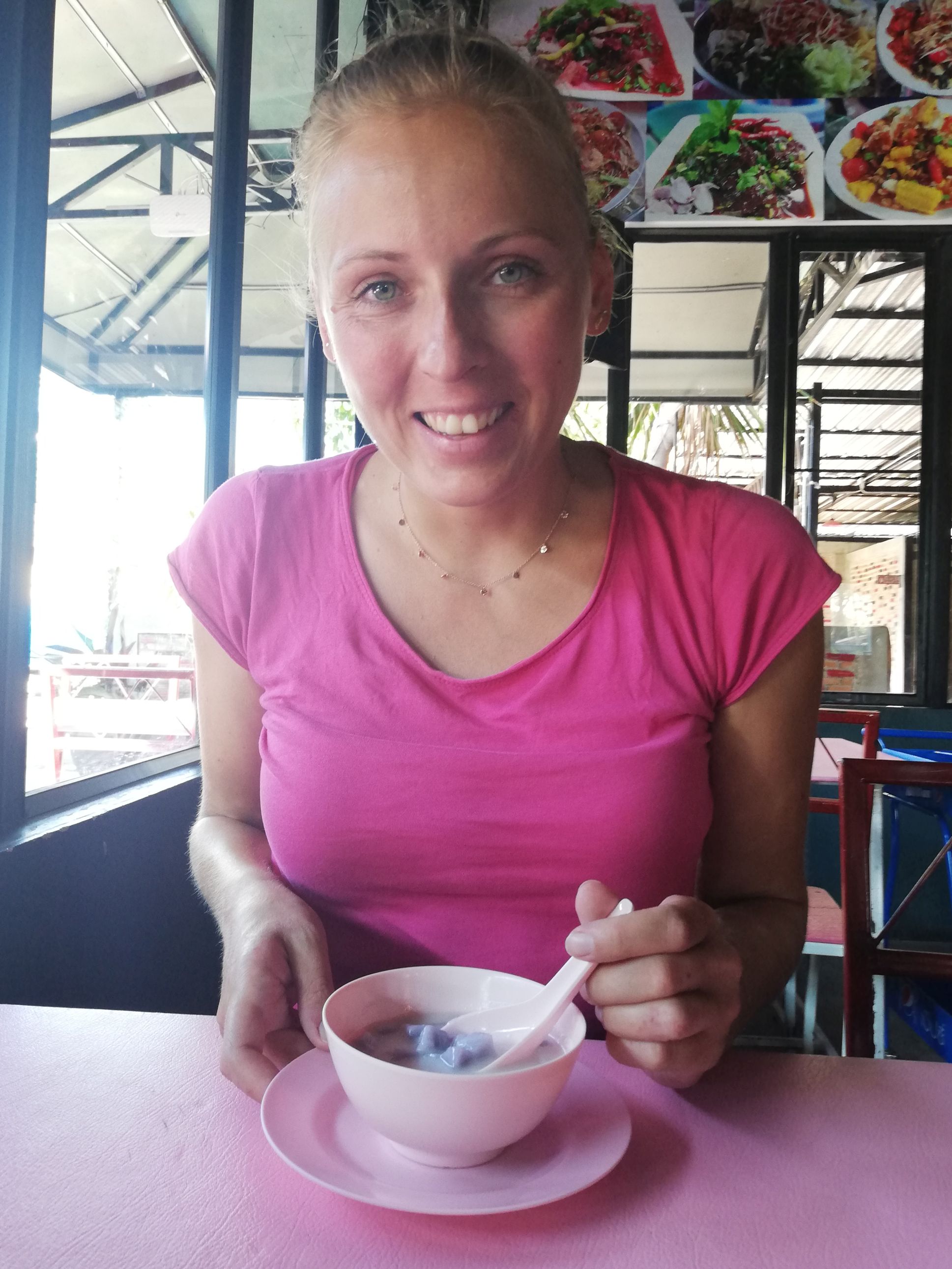Etwas überfordert von den ganzen Eindrücken ließen wir den letzten Abend in einer kleinen Garküche mit eingewachsenem Baum, lustigem Hündchen und leckerem Essen ausklingen. Zum Thema Essen kann man noch die Süßspeise Taro Balls in Kokosmilch erwähnen. Die kleinen Kügelchen aus der gleichnamigen Wurzel konnten Eva überzeugen, für mich waren die schlotzigen Bröckchen in süßer Soße eher ein Abtörner.