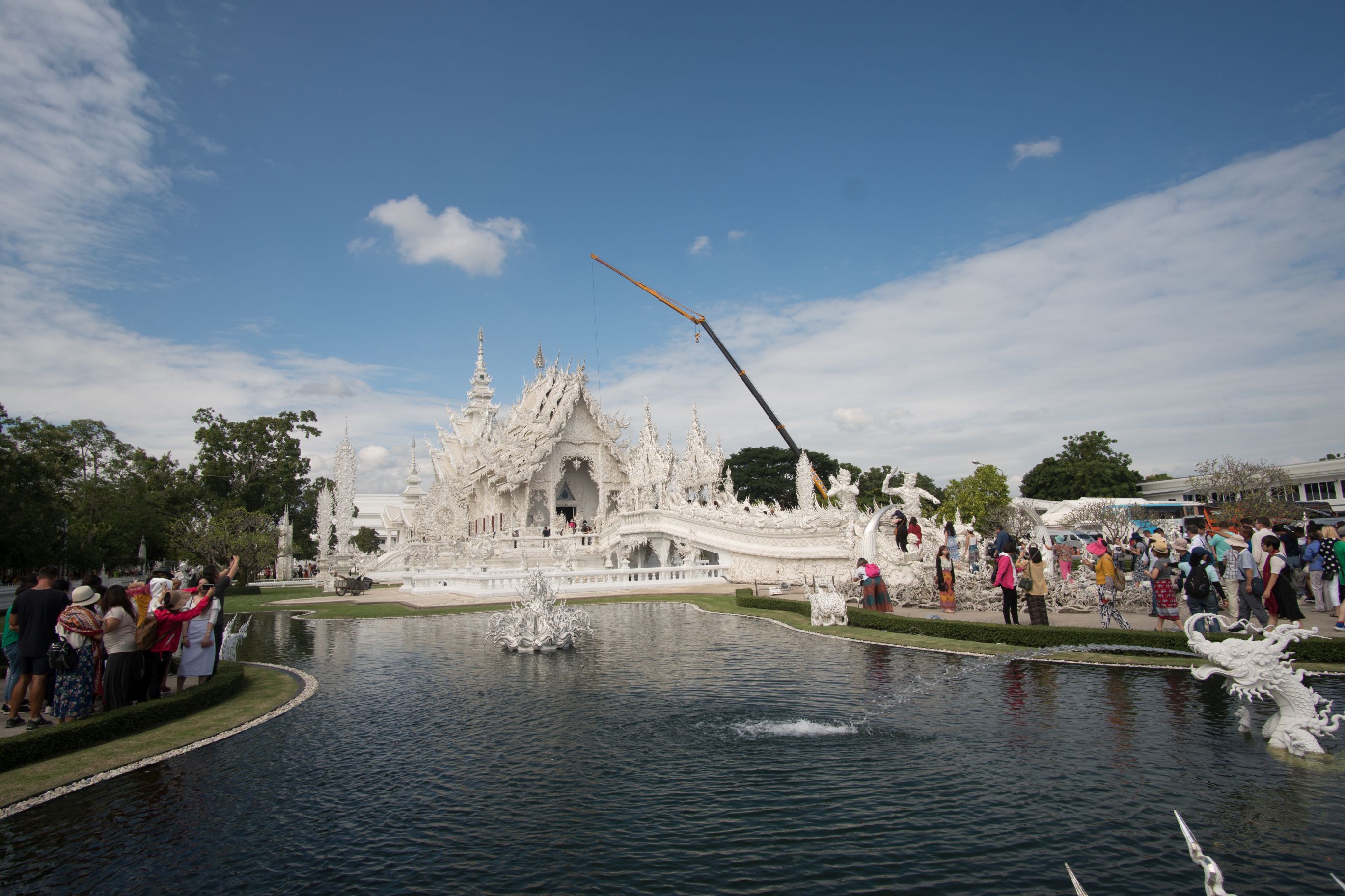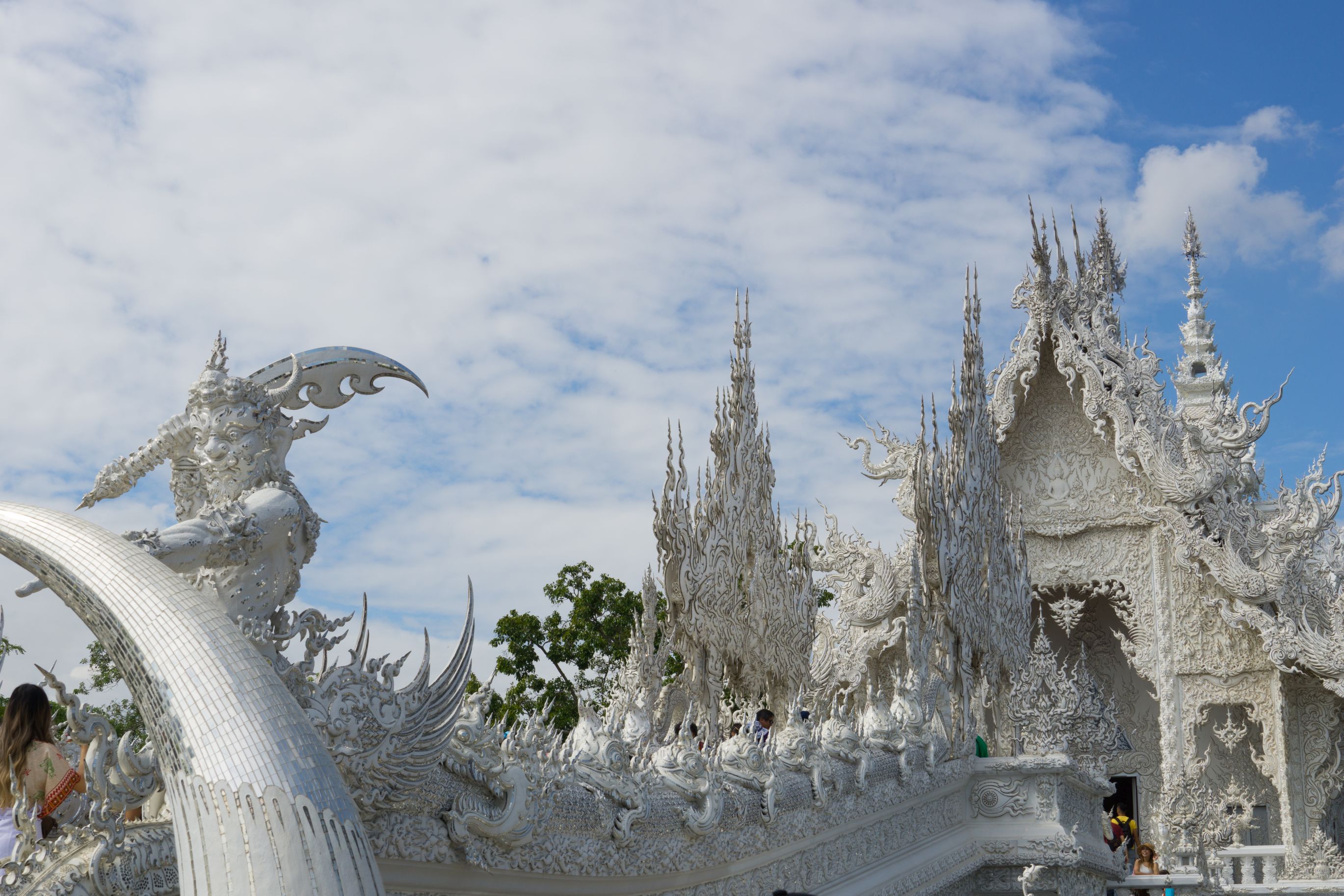 Den Abschluss machte für uns die wahrscheinlich bekannteste Tempelanlage in Chiang Rai, der weiße Tempel - Wat Rong Khun. Ebenfalls noch immer im Bau, soll die komplette Anlage erst in knapp 50 Jahren fertiggestellt werden. Dieser Umstand hielt aber weder uns noch millionzig andere Touristen davon ab, der Baustelle einen Besuch abzustatten. Hat man sich erstmal an die Menschenmassen gewöhnt, ist es zwar immer noch brechend voll aber man stresst sich nicht mehr damit, das perfekte Foto zu bekommen. Ohne fremde Rüben vor der Linse, wird das hier eh nichts. Der weiße Tempel hat seinen Namen - der aufmerksame Leser kann nun mit seinem Wissen glänzen - richtig: er ist weiß. Das klingt erstmal unspektakulär, aber tatsächlich wirken die Details der Anlage im gleißenden Sonnenlicht wie der Eingang zum Himmel. Und so ist es auch für die Besucher thematisch aufgebaut: Über eine Brücke gelangt man - im Gänsemarsch - von der Hölle zum Himmel. Stehenbleiben, um zu fotografieren oder gar auf der Brücke umkehren ist strengstens untersagt. Das kleine Rollenspiel funktioniert, wer würde schon gern vom Himmel zurück in die Hölle latschen. Im Inneren des Tempels herrscht absolutes Fotografieverbot. Wer das Überraschungsmoment für einen eigenen Besuch erhalten möchte, sollte den Rest dieses Absatzes überspringen. Die Wandbemalung zieren völlig unerwartet Mickey Maus, Batman, Michael Jackson, Osama Bin Laden, Meister Yoda und viele weitere Personen oder Phantasiegestalten der Neuzeit. Ein Spaß hier auf Entdeckungsreise zu gehen.