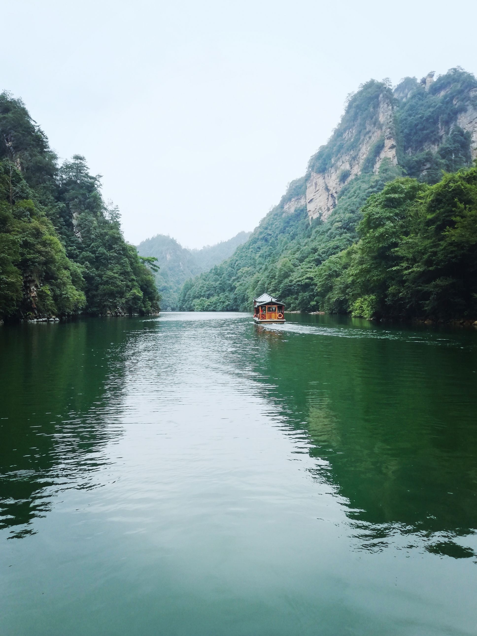 Den bekannten Beilong-Elevator, einen Glasfahrstuhl ließen wir aus: 10 Euro für ein paar Sekunden mit 50 anderen Menschen in einem kleinen Glaskasten eingesperrt zu sein, erschien uns irgendwie Budged-schädigend. Genauso wie die berühmte Glasbrücke, die wir eigentlich an unserem Abreisetag noch "mitnehmen" wollten. Wir saßen bereits im Shuttle-Bus um dorthin zu gelangen, doch unsere forsche Busfahrerin riet uns davon ab. Stattdessen empfahl sie uns eher den Baofeng-See zu besuchen. Wir waren etwas überrascht von Ihrer "Hartnäckigkeit", immerhin dauerte unser "Gespräch" per Google-Übersetzer doch etwas länger. Sie meinte sinngemäß: "zu teuer und nicht besonders aufregend". Die meisten Touristen seien wohl enttäuscht. So einen Rat nahmen wir gerne an, außerdem hätten wir die drolligen Dame auch nicht vor den Kopf stoßen wollen. Somit also Baofeng, zu dem sie uns auch direkt hin fuhr (eigentlich sollte sie ja zur Brücke fahren, hmm). Auch der See kostete natürlich nochmal extra. Im Preis inbegriffen ist aber eine kleine Bootsfahrt mit gelegentlichen Gesängen der Tujia-Minderheit vom Ufer aus.