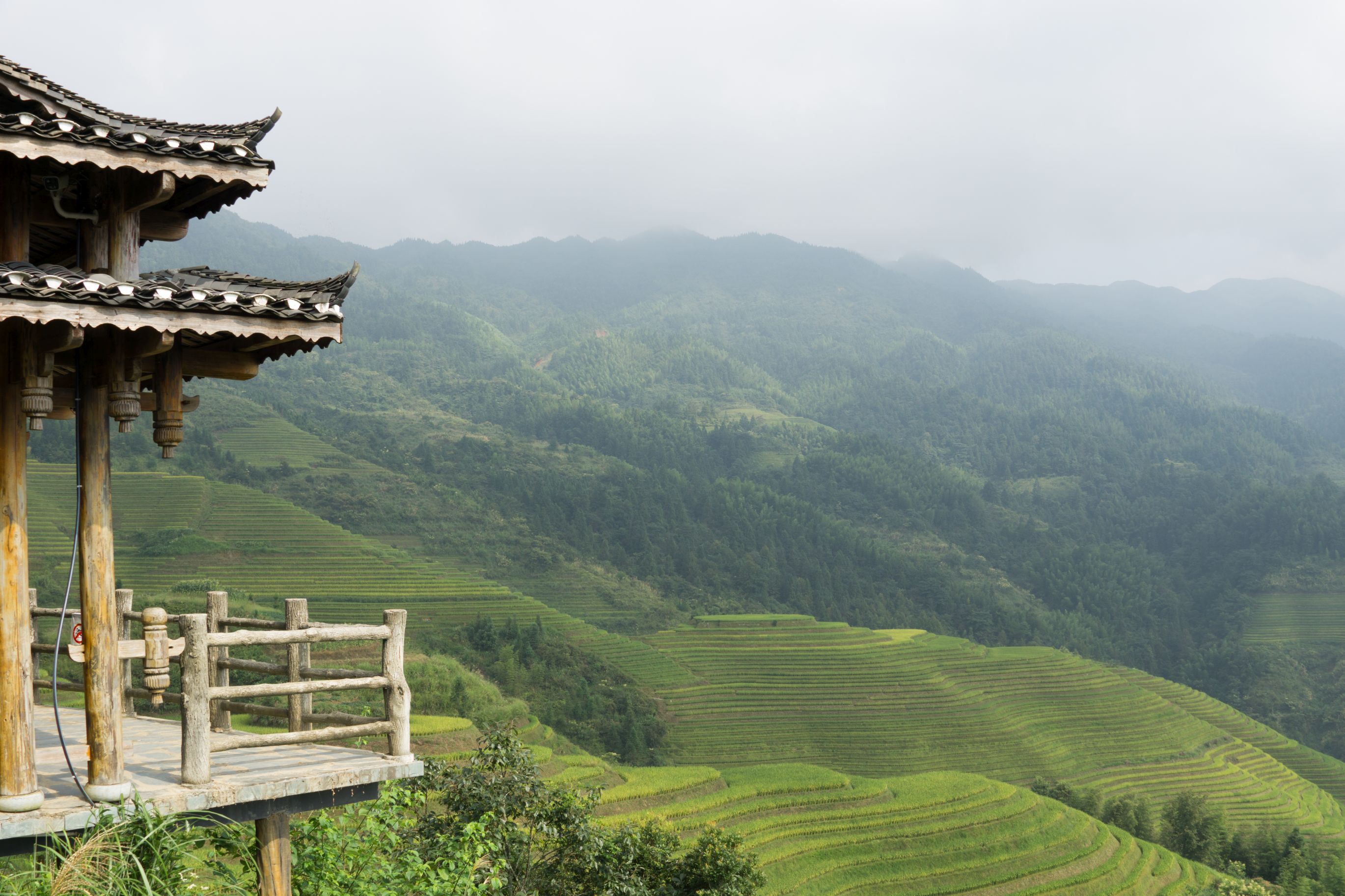 Mit dem Bus, den uns das Ease Hostel organisiert hatte, ging es dann in den Norden zu den Reisterrassen von Longsheng. Wir hatten ein Hostel in dem etwas weniger bekannten Örtchen Dazhai genauer gesagt Tiántouzhài gebucht. Der Bus schmiss uns also in Dazhai raus, wir schulterten unsere Habseligkeiten und los ging die 40 minütige Wanderung zum Dragon's Den Hostel. Es war heiß, es war steil, es war anstrengend. Aber bereits nach knapp einer halben Stunde sahen wir unsere Unterkunft direkt am Hang. Ein sehr befriedigendes Gefühl die letzten Steinstufen durch die Reisterrassen zu erklimmen und direkt im Eingangsbereich des Hostels anzukommen.
