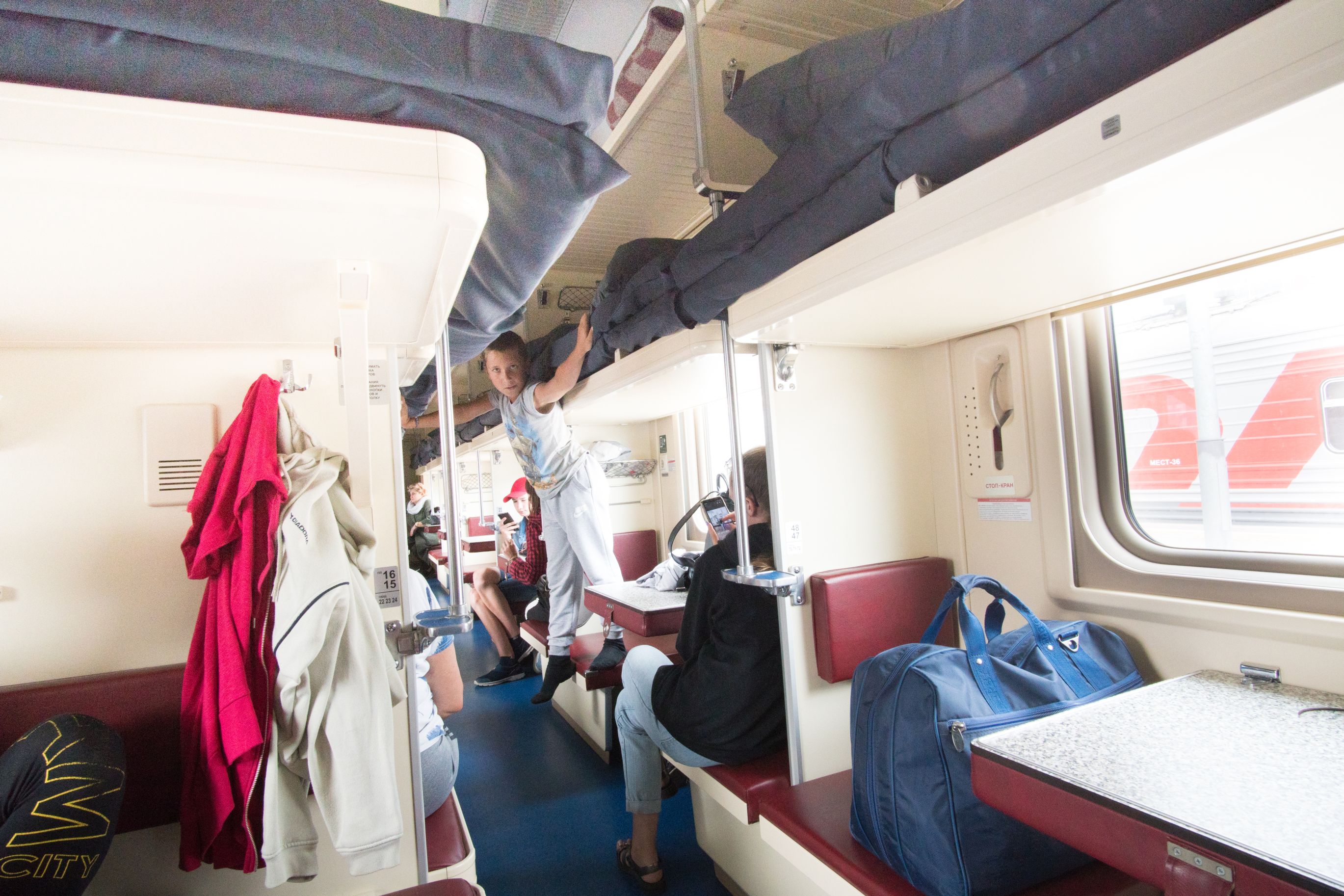 Wir verstauten unser Gepäck unter der Sitzbank und inspizierten erstmal alles. Die obere Liege konnte durch seitlich angebrachte Fußtritte erreicht werden. Unsere Matratzen und Decken lagen auf der darüber angebrachten Ablage. Froh waren wir, nicht die Betten längs zum Gang bekommen zu haben. Dort kann zwar das untere Bett mit einer simplen Konstruktion in einen Tisch und zwei Sitzplätze umfunktioniert werden, durch den fehlenden Extratisch hat man aber deutlich weniger Platz zum rumlümmeln als wir es hatten. Insgesamt war alles sehr viel besser ausgestattet als befürchtet. Im Grunde wie ein normaler Zug mit Liegen statt Sitzen. Bei so viel Normalität kam man sich schon etwas komisch vor Fotos zu knipsen oder mit der GoPro den Gang zu filmen.
